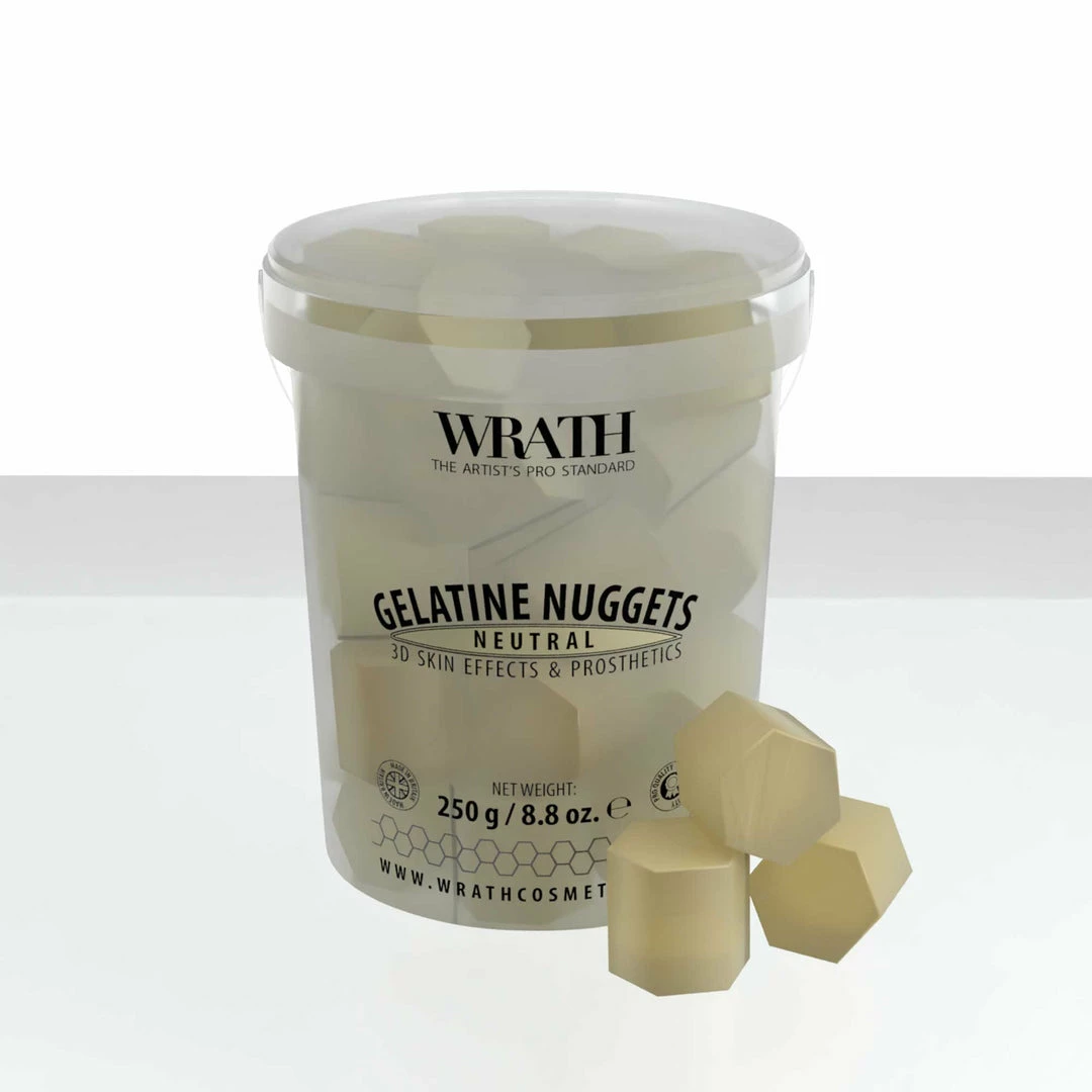 Directions for use; to apply, heat the nuggets by using the instructions below. Once heated, apply any pigmentation required and either apply directly to skin (allow to cool prior to application on skin) or pouring into prosthetic mould. Edges may be blended out into skin using WRATH Witch Hazel. Powder after application to remove natural tackiness of gelatine. Heat Gelatine Nuggets in the microwave by gently heating them in a microwavable container 5 to 15 seconds at a time, stirring in-between, until reaching a smooth, thick liquid consistency. Do not overheat; overheating may damage Gelatine Nuggets, rendering them unusable. If bubbling occurs, immediately stop heating.