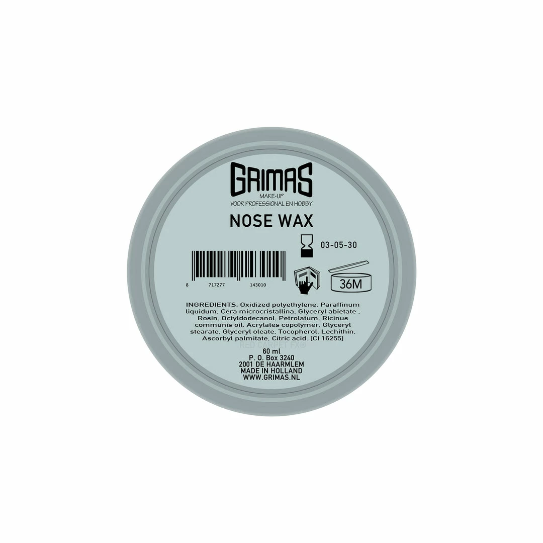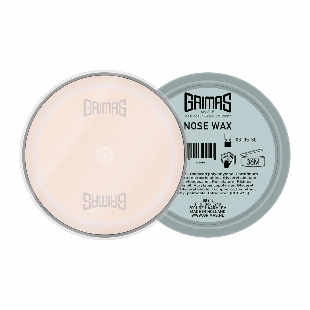 Grimas Nose Wax is a malleable material that can be used for creating all sorts of deformations of the nose or chin during make-up. It is less suitable for sticking to mobile parts of the skin; use Grimas Derma Wax for that.Â