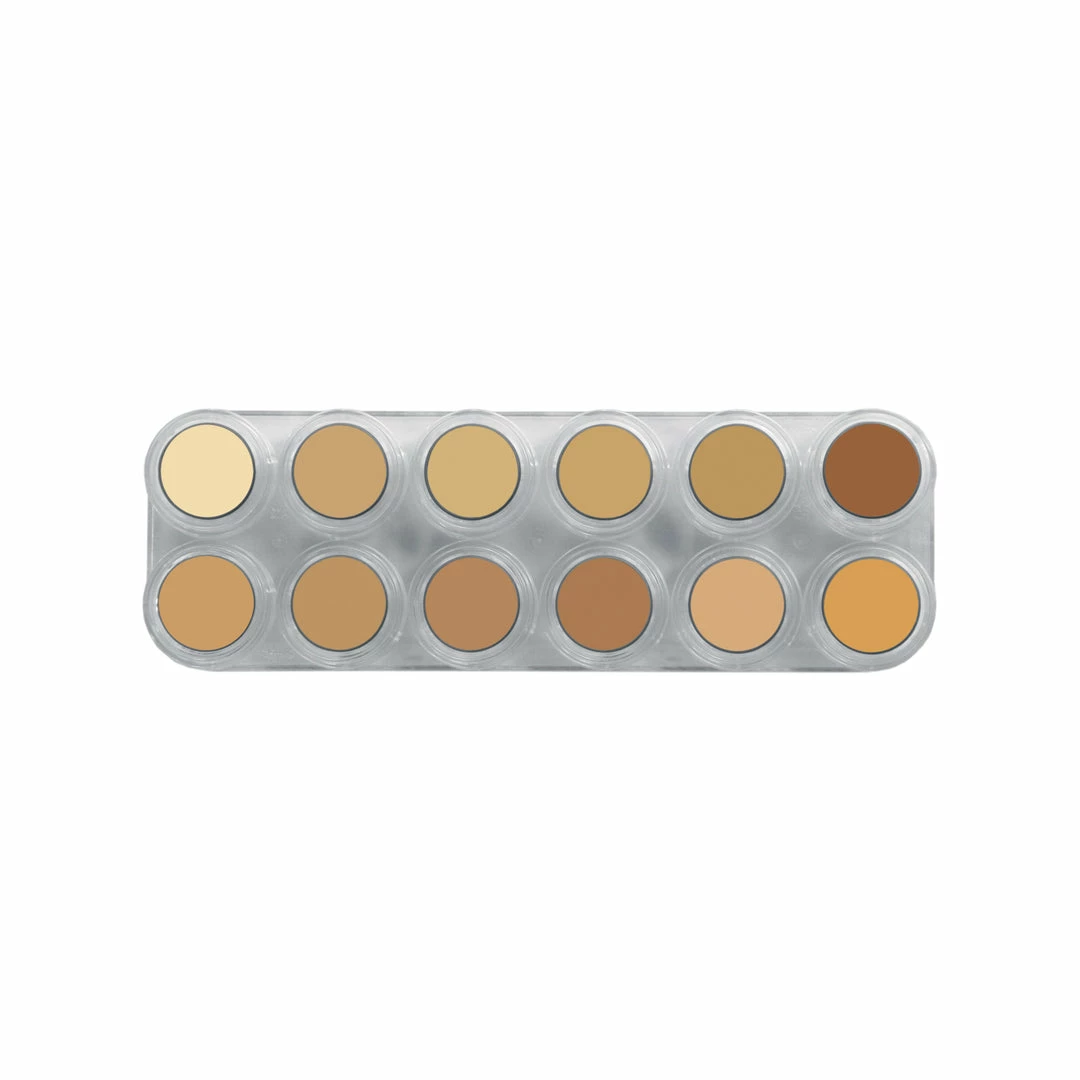 Grimas Crème Make-up Pure is a make-up that has good covering capabilities and is based on oils and waxes. Crème Make-up Pure is used for visagie and theatrical make-up. The waxes and oils allow Crème Make-up Pure to be blended away easily, making it excellent for highlights and shadows, both for visagie (shaping, modelling) and theatrical purposes (ageing, creating various characters, effects). Crème Make-up Pure can also be used as cream eye shadow or blusher. The colours can be mixed together.