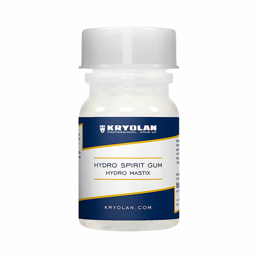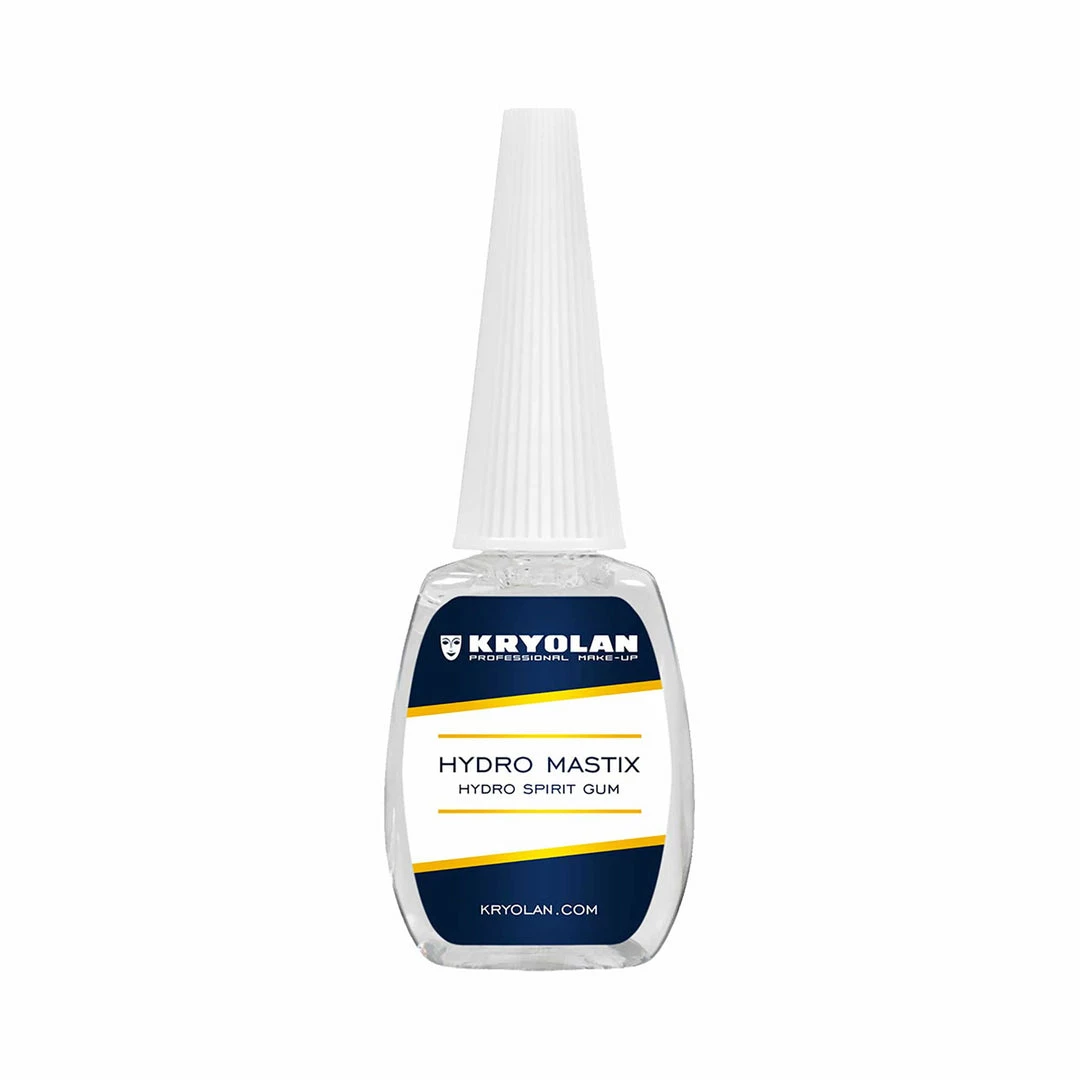 Kryolan Hydro Mastix is a unique adhesive for make up artists; it is water based and contains no solvents, hence making the product gentler on skin. Hydro Spirit Gum is effective adhesive for adhering objects for shorter periods of time. It is perfect for holding down hair and eyebrows before they are covered with a bald cap or plastic film.
