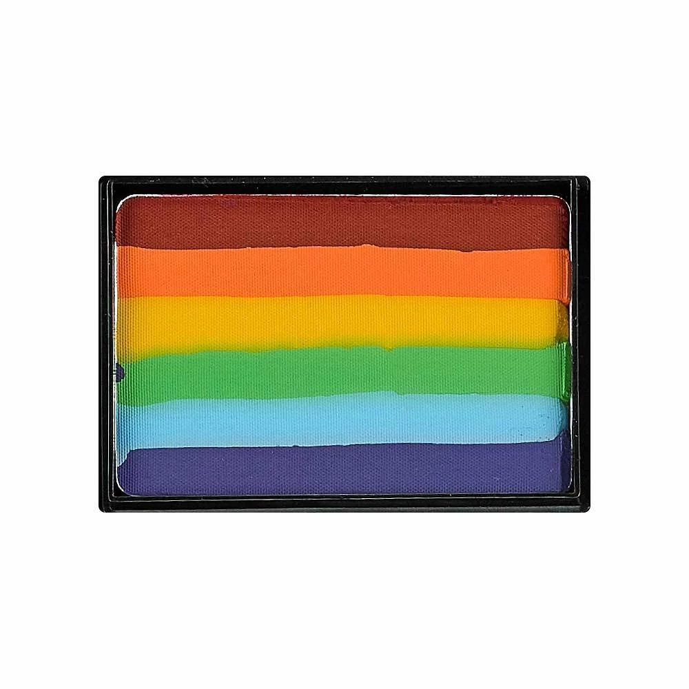 Application with Sponge: Dampen sponge in water, ring out any excess water. Begin by placing the sponge at one end of the Prism cake and swipe the sponge across to the other side, back and forth without lifting the sponge. This helps keep the lines in place. When sponge is fully loaded, place on the area to be designed and “pat” colors onto the skin.