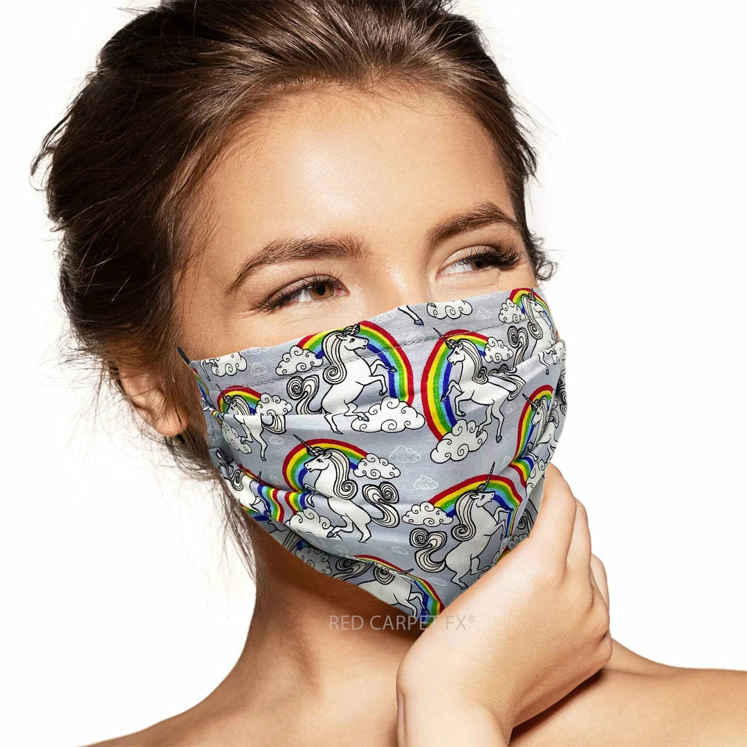 Bright and colourful; the Unicorns pattern features everything you need to face a gloomy day including vivid rainbows, fluffy clouds and rearing unicorns on a very light blue material. Introducing handmade cotton face masks expertly created by Pebbles of Leeds.