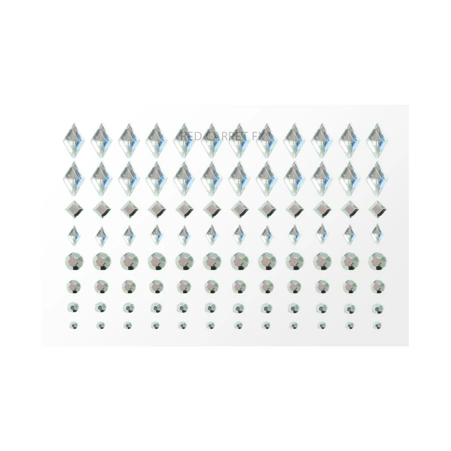 A sheet of 100 clear reflective jewels/gems in an array of different sizes and shapes.