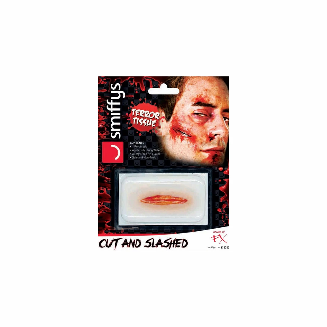 Cut and slash face and body prosthetic that gives a fantastic illusion of visible realistic lacerations to the skin. Smiffys Horror Wounds Transfers are a water-based prosthetic that is applied the same way as a temporary tattoo; simply remove from packaging apply to skin in the desired location with just water.