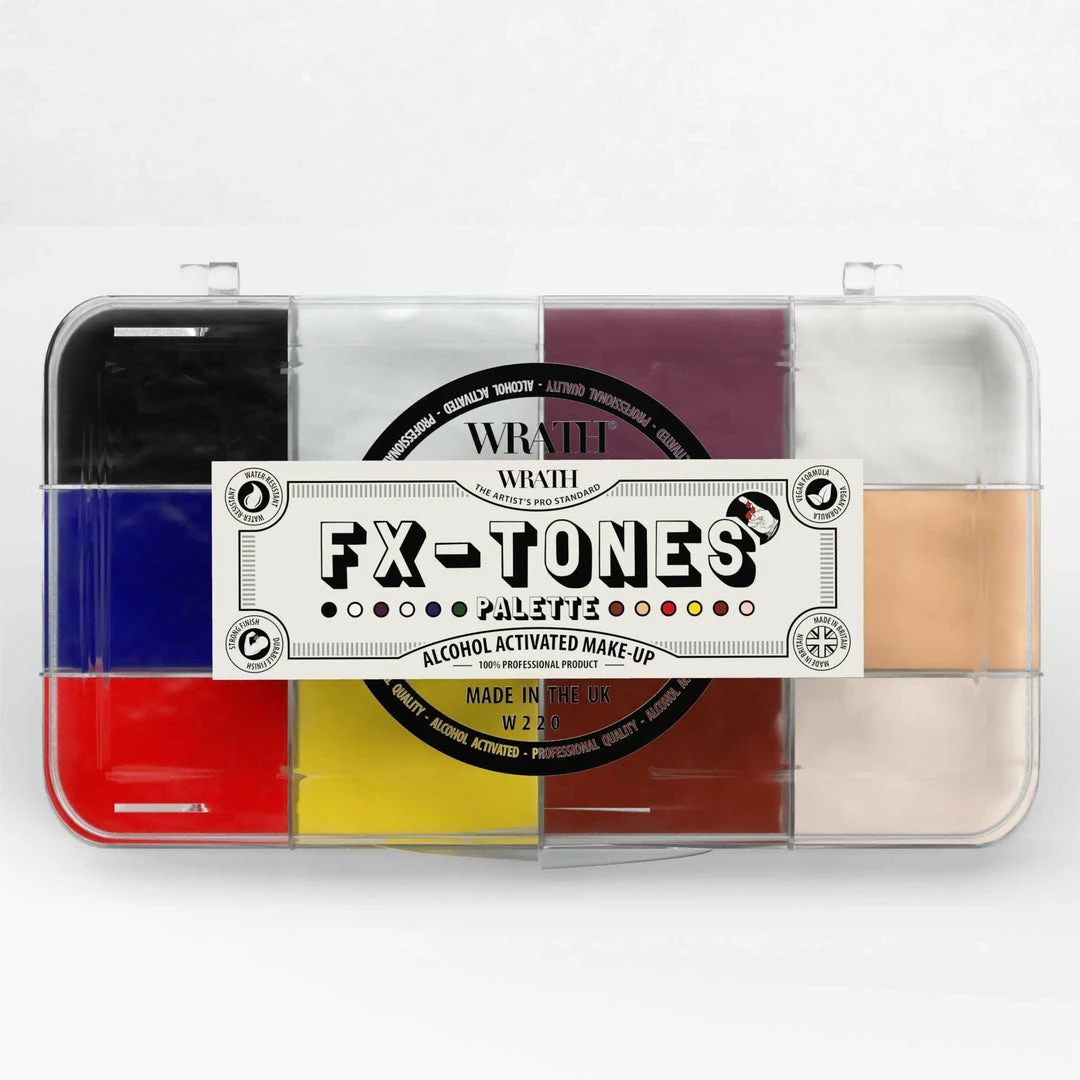The FX-Tones palette is an essential mix blood, trauma and general special fx shades. Featuring 3 red hues, 3 beige hues, a purple, green, blue, yellow, black and white. Also includes 100ml WRATH Alcohol Activator.