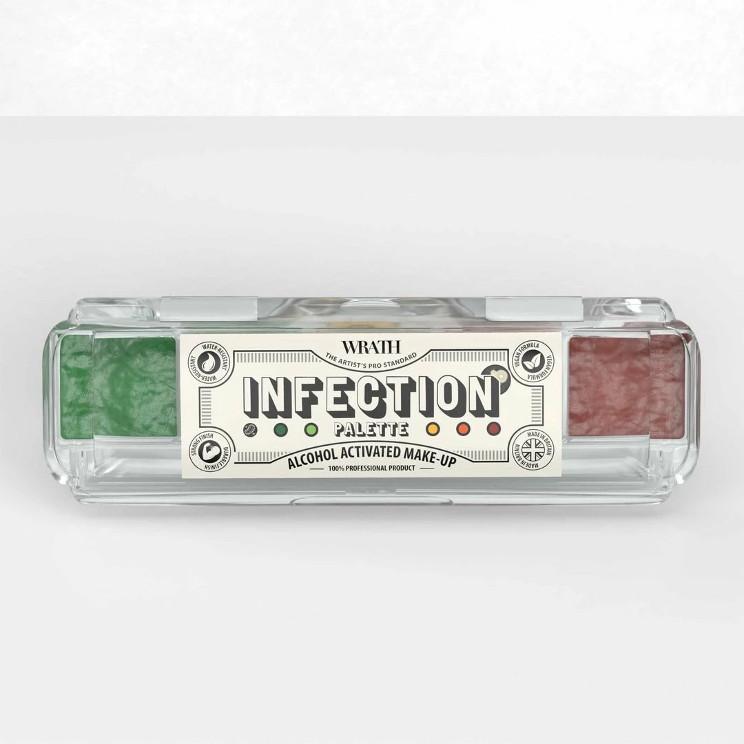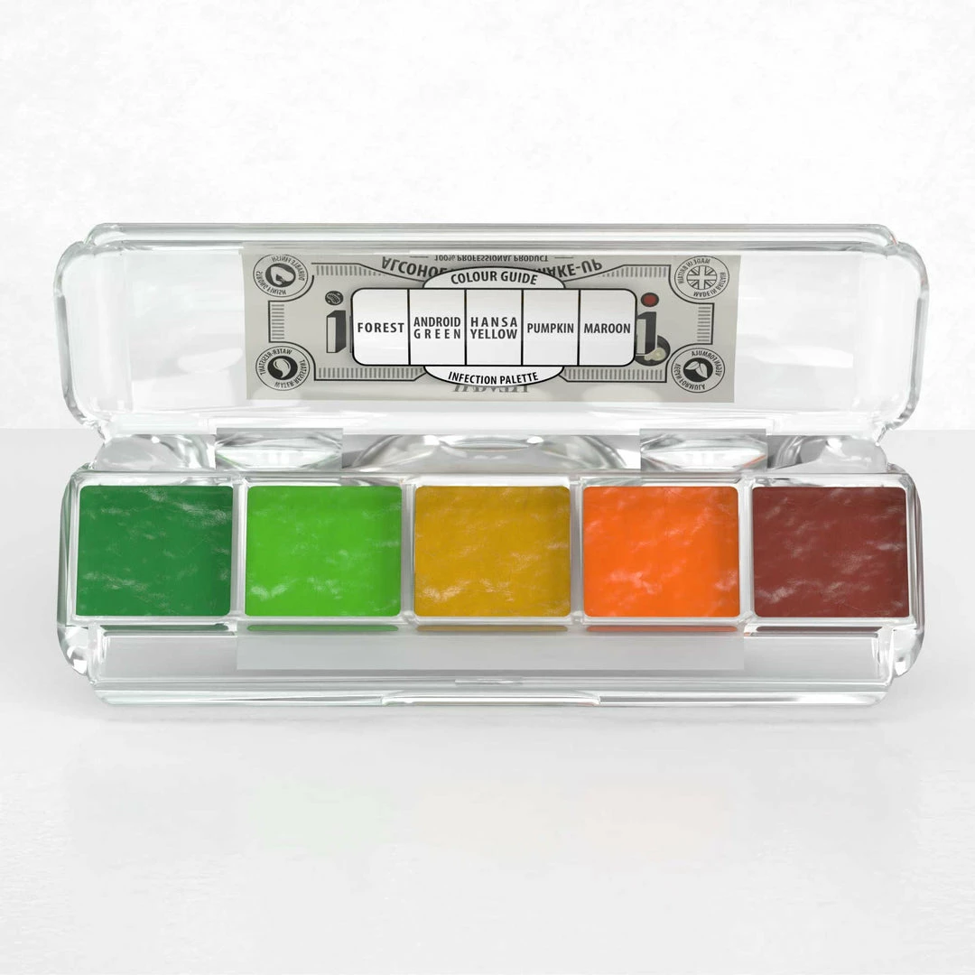 The Infection palette is an handy compact palette for puss, boils and infection effects. Featuring two greens, yellow, orange and red. Requires WRATH Alcohol Activator to use (sold separately).